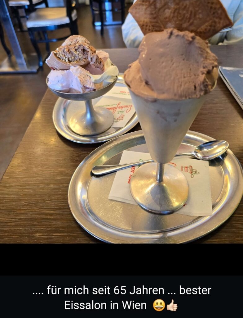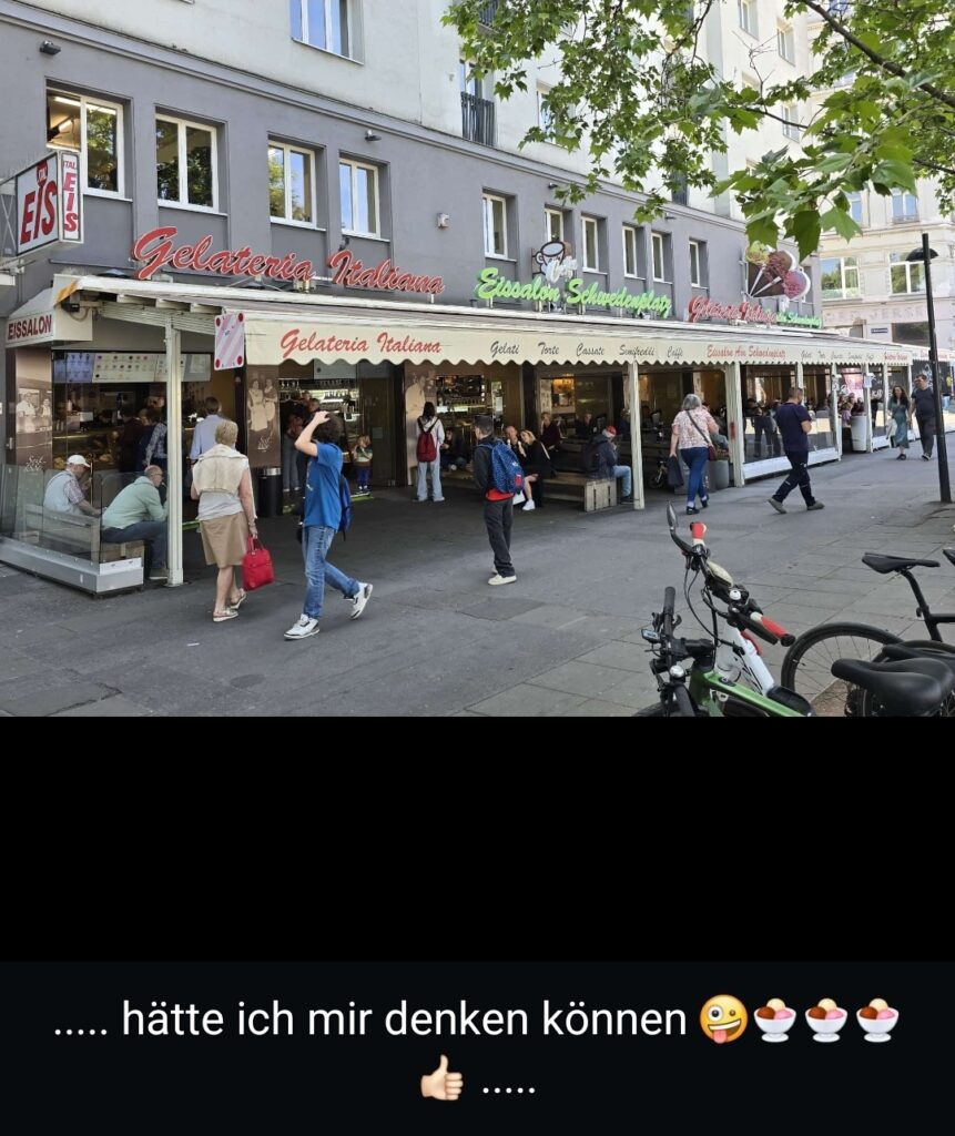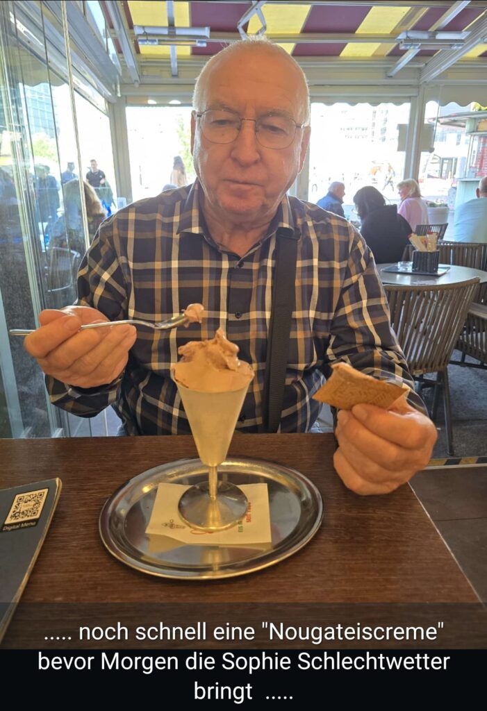 Gestern, Mittwoch, haben wir uns auf den Weg gemacht. Zum ersten Mal in diesem Jahr, haben wir uns auf die ‚Einser Runde‘ begeben. Bei herrlichem Sonnenschein, haben wir im Prater beim ‚Englischen Reiter‘ zu Mittag gegessen. Dann ist es mit der Straßenbahn ‚Linie 1‘ zum Schwedenplatz gegangen. Hier haben wir im ‚Eissalon Schwedenplatz‘ ein leckeres Eis gegessen. Müde vom vielen Gehen geht es wieder nach Hause. Gerade richtig erwischt, denn Heute haben wir die ‚Sophie‘ – feuchtkühles Wetter.
